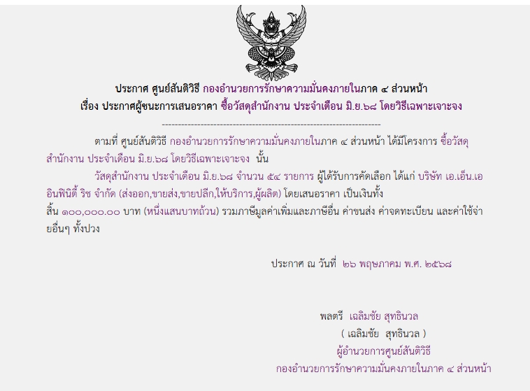 จัดซื้อ จัดจ้างประกาศผู้ชนะการเสนอราคา ประกาศผู้ชนะการเสนอราคา ซื้อวัสดุสำนักงาน ประจำเดือน มิ.ย.๖๘ โดยวิธีเฉพาะเจาะจง May 31, 2025 127 Share Facebook Twitter Google+ Telegram LINE ประกาศผู้ชนะการเสนอราคา ซื้อวัสดุสำนักงาน ประจำเดือน มิ.ย.๖๘ โดยวิธีเฉพาะเจาะจง