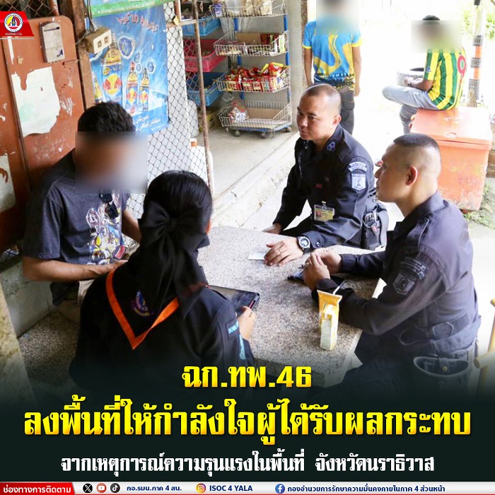 🗓️ Pada 2 Jun 2025 jam 11.00 pagi, Kolonel Sitthichai Bamrungket, Komander Pasukan Petugas Khas Rejimen Renjer 46, telah mengarahkan Kapten Phattanawut Sangsuwan, Ketua Bahagian Hal Ehwal Awam, untuk membawa anggota ke lapangan melawat dan memberi sokongan moral kepada mangsa kejadian keganasan di Kampung Pondok, Mukim Suwaree, Daerah Rue So, Wilayah Narathiwat.