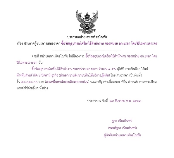 จัดซื้อ จัดจ้างประกาศผู้ชนะการเสนอราคา ประกาศผู้ชนะการเสนอราคา ซื้อวัสดุอุปกรณ์เครื่องใช้สำนักงาน ของหน่วย ฉก.ยะลา โดยวิธีเฉพาะเจาะจง (36,036.00) January 14, 2021 884 Share Facebook Twitter Google+ Telegram LINE ฉก.อโณทัย