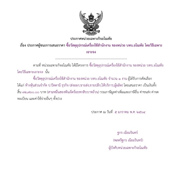 ประกาศผู้ชนะการเสนอราคา ซื้อวัสดุอุปกรณ์เครื่องใช้สำนักงาน ของหน่วย บทบ.อโณทัย โดยวิธีเฉพาะเจาะจง (32,760.00)