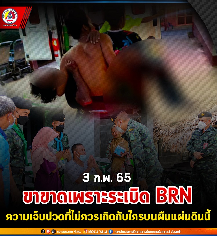 Melihat luka yang takkan pernah sembuh… Dari peristiwa pada 3 Februari 2022, hari di mana seorang penduduk biasa terpaksa menghadapi mimpi ngeri seumur hidup – Encik Suttisak Meensen, seorang penduduk dari Kampung Ban Na, Daerah Jana, Wilayah Songkhla, sedang keluar menangkap ikan di jambatan kereta api Ban Nam Khem apabila beliau terpijak bom yang dipasang oleh kumpulan BRN.