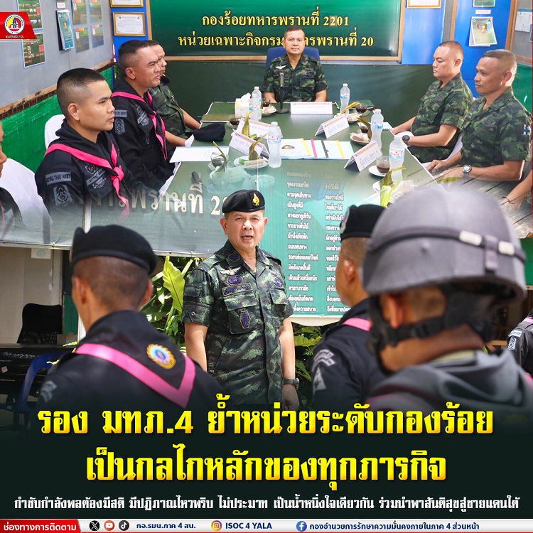 Hari ini (5 Jun 2025), jam 10.20 pagi, Mejar Jeneral Waradet Detchaksa, Timbalan Komander Tentera Wilayah 4 merangkap Timbalan Pengarah Keselamatan Dalam Negeri Wilayah 4 Bahagian Hadapan, bersama wakil-wakil bahagian pentadbiran daripada Markas Keselamatan Dalam Negeri Wilayah 4 Bahagian Hadapan, telah melawat Kompeni 2201, Pasukan Khas Rejimen Renjer Sempadan 22 di Daerah Yarang, Wilayah Pattani. Lawatan ini bertujuan untuk meninjau pelaksanaan tugas, memahami situasi semasa serta menyampaikan dasar dan arahan untuk memastikan pelaksanaan tugas yang teliti, berhati-hati dan paling berkesan. Turut hadir menyambut adalah Kolonel Uthen Jeenthonglang, Komander Pasukan Khas Rejimen Renjer Sempadan 22, bersama para anggota.