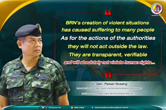 Lt. Gen. Paisan Nusang, Commander of the 4th Army Region / Director of Internal Security Operations Region 4, in an interview on the program “Casual Talk in General Paisan’s Style,” Episode 7