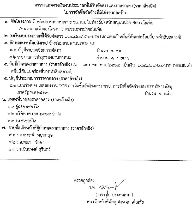 ตารางแสดงวงเงินงบประมาณที่ได้รับจัดสรร และราคากลางในการจัดซื้อจัดจ้างที่มิใช่งานก่อสร้าง ชื่อโครงการจ้างซ่อมยานพาหนะสาย ขส.(สป.ในท้องถิ่น) สนับสนุนหน่วย ศกบ.อโณทัย (694,804.50)