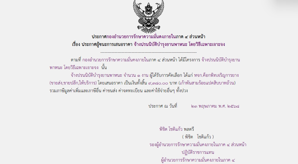 ประกาศผู้ชนะการเสนอราคา จ้างปรนนิบัติบำรุงยานพาหนะ โดยวิธีเฉพาะเจาะจง
