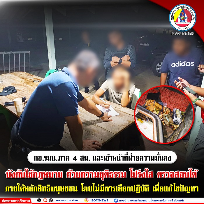 ทั้งนี้กองอำนวยการรักษาความมั่นคงภายในภาค 4 ส่วนหน้า และเจ้าหน้าที่หน่วยความมั่นคง จะดำเนินการบังคับใช้กฎหมาย ด้วยความยุติธรรม โปร่งใส ตรวจสอบได้ ภายใต้หลักสิทธิมนุษยชน โดยไม่มีการเลือกปฏิบัติ เพื่อแก้ปัญหาในพื้นที่จังหวัดชายแดนภาคใต้ และขอความร่วมมือพี่น้องประชาชนในพื้นที่ หากผู้ใดพบเบาะแส หรือพบวัตถุต้องสงสัย รวมถึงบุคคลต้องสงสัยเข้ามาเคลื่อนไหวในพื้นที่ สามารถแจ้งได้ที่หมายเลขโทรศัพท์สายตรงแม่ทัพภาคที่ 4 / ผู้อำนวยการรักษาความมั่นคงภายในภาค 4 โทร 061-1732999 หรือเบอร์สายด่วน กอ.รมน.ภาค 4 สน. 1341 และหน่วยเฉพาะกิจในพื้นที่ได้ตลอด 24 ชั่วโมง