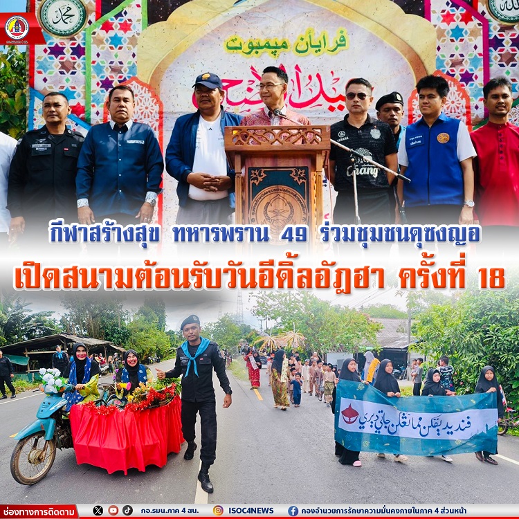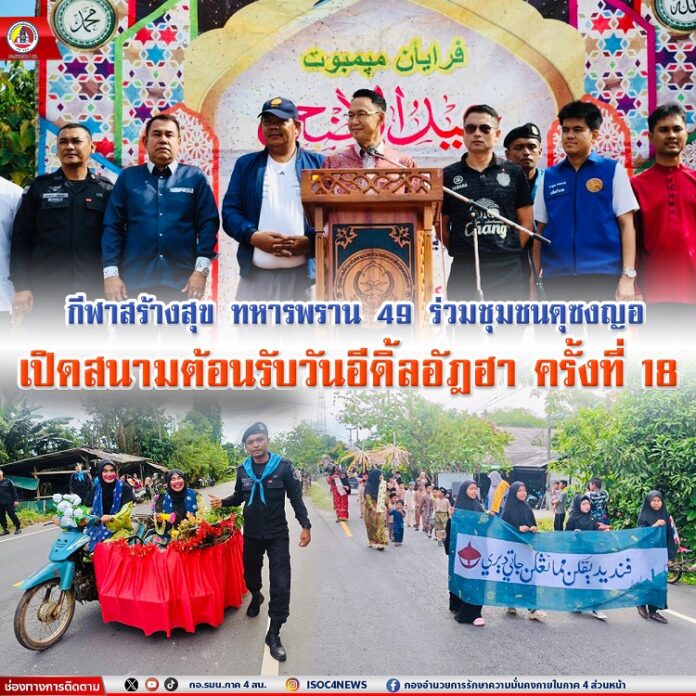 เมื่อวันที่ 9 มิถุนายน 2568 เวลา 09.00 น. กองร้อยทหารพรานที่ 4911 หน่วยเฉพาะกิจกรมทหารพรานที่ 49 นำโดย ร้อยตรี สมชาย บิลหมัด รองผู้บังคับกองร้อย พร้อมด้วยรองหัวหน้าชุดปฏิบัติการกิจการพลเรือน และกำลังพลชุดปฏิบัติการกิจการพลเรือน ร่วมพิธีเปิดกิจกรรมกีฬาต้อนรับวันอีดิ้ลอัฎฮา ครั้งที่ 18