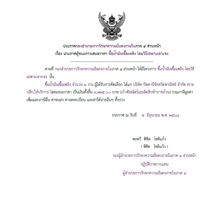 ประกาศผู้ชนะการเสนอราคา ซื้อน้ำมันเชื้อเพลิง โดยวิธีเฉพาะเจาะจง
