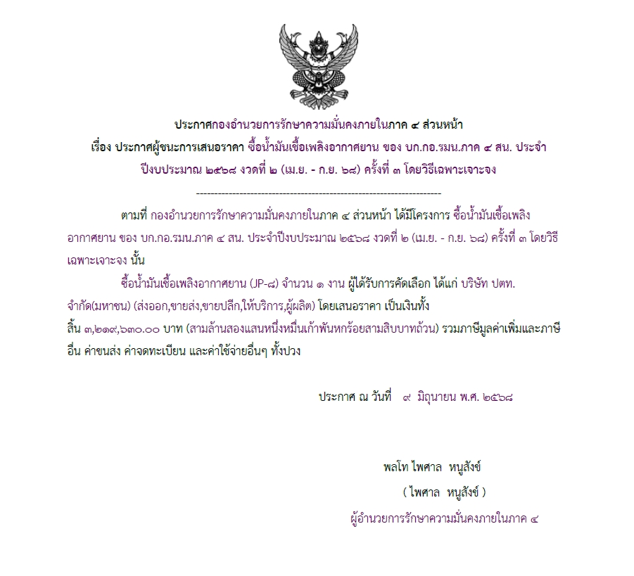 จัดซื้อ จัดจ้างประกาศผู้ชนะการเสนอราคา ประกาศผู้ชนะการเสนอราคา ซื้อน้ำมันเชื้อเพลิงอากาศยาน ของ บก.กอ.รมน.ภาค ๔ สน. ประจำปีงบประมาณ ๒๕๖๘ งวดที่ ๒ (เม.ย. – ก.ย. ๖๘) ครั้งที่ ๓ โดยวิธีเฉพาะเจาะจง June 13, 2025 146 Share Facebook Twitter Google+ Telegram LINE