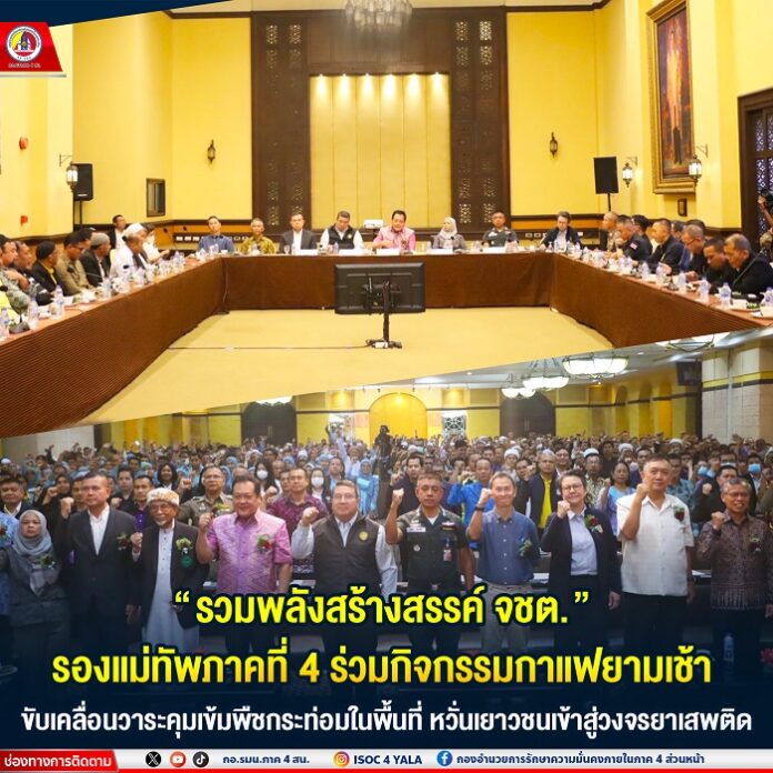 วันนี้ (14 มิถุนายน 2568) เวลา 08.30 น. ที่ห้องน้ำพราวบอลรูม โรงแรม ซี.เอส.ปัตตานี ตำบลรูสะมิแล อำเภอเมือง จังหวัดปัตตานี พลตรี วรเดช เดชรักษา รองแม่ทัพภาคที่ 4 / รองผู้อำนวยการรักษาความมั่นคงภายในภาค 4 ส่วนหน้า ร่วมกิจกรรมกาแฟยามเช้า รวมภาคีเครือข่าย เพื่อประกาศวาระการควบคุมการใช้พืชกระท่อมในจังหวัดชายแดนภาคใต้ ซึ่งจัดโดยศูนย์อำนวยการบริหารจังหวัดชายแดนภาคใต้ (ศอ.บต.) ร่วมกับ สำนักงานป้องกันและปราบปรามยาเสพติด ภาค 9 (สำนักงาน ป.ป.ส. ภาค 9) โดยมี พันตำรวจเอก ทวี สอดส่อง รัฐมนตรีว่าการกระทรวงยุติธรรม เป็นประธานในกิจกรรม พร้อมด้วย พันตำรวจโท วรรณพงษ์ คชรักษ์ เลขาธิการศูนย์อำนวยการบริหารจังหวัดชายแดนภาคใต้, นางสาว อารีภักดิ์ เงินบำรุง รองเลขาธิการคณะกรรมการป้องกันและปราบปรามยาเสพติด, นางพาตีเมาะ สะดียามู ผู้ว่าราชการจังหวัดปัตตานี, หัวหน้าส่วนราชการ, คณะผู้บังคับบัญชา ทหาร ตำรวจ ฝ่ายปกครอง ตลอดจนผู้นำท้องที่ ผู้นำท้องถิ่น ผู้นำศาสนา ภาคประชาสังคมเข้าร่วมในกิจกรรม