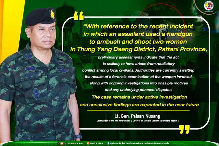 “…With reference to the recent incident in which an assailant used a handgun to ambush and shoot two women in Thung Yang Daeng District, Pattani Province, preliminary assessments indicate that the act is unlikely to have arisen from retaliatory conflict among local civilians. Authorities are currently awaiting the results of a forensic examination of the weapon involved, along with ongoing investigations into possible motives and any underlying personal disputes. The case remains under active investigation, and conclusive findings are expected in the near future…”