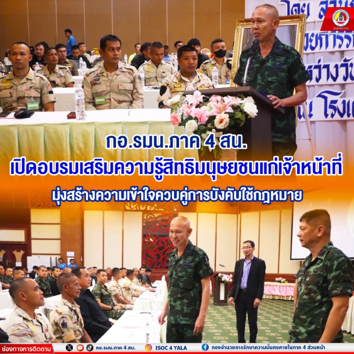 ทั้งนี้ การอบรมดังกล่าวมีวัตถุประสงค์เพื่อเสริมสร้างความตระหนักรู้และปลูกฝังจิตสำนึกแก่เจ้าหน้าที่ผู้ปฏิบัติงานในโครงสร้างของกองอำนวยการรักษาความมั่นคงภายในภาค 4 ส่วนหน้า ให้มีความเข้าใจในหลักสิทธิมนุษยชน การปฏิบัติตามกฎหมายโดยยึดหลักนิติธรรม จรรยาบรรณ และการคุ้มครองสิทธิและเสรีภาพของประชาชนอย่างทั่วถึงและเท่าเทียม เพื่อส่งเสริมความเป็นธรรม ความเสมอภาค และสันติสุขในพื้นที่จังหวัดชายแดนภาคใต้ มีการอบรมแบ่งออกเป็น 3 กิจกรรมหลัก ทั้งการบรรยายให้ความรู้ โดยวิทยากรผู้ทรงคุณวุฒิในประเด็นสำคัญ ประกอบด้วย พระราชบัญญัติกฎอัยการศึก พ.ศ.2457 , พระราชกำหนดการบริหารราชการในสถานการณ์ฉุกเฉิน พ.ศ.2548 , พระราชบัญญัติการรักษาความมั่นคงภายในราชอาณาจักร พ.ศ.2551 , พระราชบัญญัติป้องกันและปราบปรามการทรมานและการกระทำให้บุคคลสูญหาย พ.ศ.2565 , ระเบียบ กอ.รมน.ภาค 4 สน. ว่าด้วยการปฏิบัติงานตามกฎหมายความมั่นคง , หลักสิทธิมนุษยชนและปฏิญญาสากลว่าด้วยสิทธิมนุษยชน นอกจากนี้ ยังมีการแลกเปลี่ยนประสบการณ์ โดยการแบ่งกลุ่มผู้เข้ารับการอบรมเพื่อหารือและถกแถลงในประเด็นเกี่ยวกับสิทธิมนุษยชนและแนวทางปฏิบัติตามกฎหมาย ตลอดจนการสรุปผล โดยแต่ละกลุ่มนำเสนอแนวทางการปฏิบัติและประเด็นข้อเสนอแนะต่อที่ประชุมร่วม พร้อมตอบข้อซักถาม ทั้งนี้ ยังมีการจัดทำแบบทดสอบก่อน และหลังการอบรมผ่านระบบ Google Forms เพื่อประเมินความรู้ความเข้าใจของผู้เข้าร่วม และนำผลลัพธ์ไปใช้ประโยชน์ในการปรับปรุงหลักสูตรในอนาคตอีกด้วย