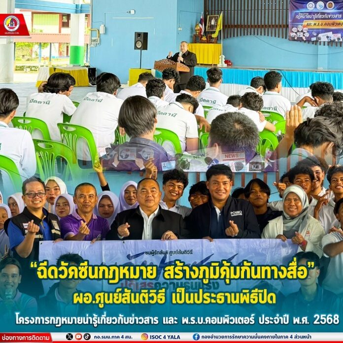 เมื่อวันที่ 18 มิถุนายน 2568 เวลา 13.00 น. ที่ วิทยาลัยเทคโนโลยีการเกษตรและประมงปัตตานี ตำบลบางตาวา อำเภอหนองจิก จังหวัดปัตตานี พลตรี เฉลิมชัย สุทธินวล ผู้อำนวยการศูนย์วิธี เป็นประธานในพิธิปิดโครงการกฎหมายน่ารู้เกี่ยวกับข่าวสาร และ พ.ร.บ.คอมพิวเตอร์ ประจำปี พ.ศ. 2568 ซึ่งโครงการดังกล่าวเป็นการทำงานแบบบูรณาการร่วมกัน ระหว่าง สมาคมเพื่อสันติภาพชายแดนใต้ กองทุนยุติธรรม กระทรวงยุติธรรม (POSBO), สำนักงานยุติธรรมจังหวัดปัตตานี, หน่วยเฉพาะกิจสันติสุข และกองภาคประชาสังคม ศูนย์สันติวิธี กองอำนวยการรักษาความมั่นคงภายในภาค 4 ส่วนหน้า มีวัตถุประสงค์เพื่อ “สร้างภูมิคุ้มกันทางสื่อ” และสร้างองค์ความรู้ ความเข้าใจเกี่ยวกับ พ.ร.บ.คอมพิวเตอร์ ให้กับเยาวชน – นักศึกษา สามารถใช้วิธีการสื่อสารผ่านโลกออนไลน์ หรือโซเชียลมีเดียได้อย่างถูกต้องเหมาะสม ตลอดจนเพื่อลดจำนวนของพี่น้องประชาชนในพื้นที่จังหวัดชายแดนใต้ที่ตกเป็นเหยื่อของการใช้วาทกรรมความขัดแย้ง หรือการสร้างความแตกแยกบนสังคมออนไลน์ โดยมี นายสุไลมาน เจ๊ะและ นายกสมาคมเพื่อสันติภาพชายแดนใต้ (POSBO), ผู้บริหารวิทยาลัยเทคโนโลยีการเกษตรและประมงปัตตานี, ผู้อำนวยการสำนักงานยุติธรรมจังหวัดปัตตานี, ชุดครูฝึกเยาวชน ชุดควบคุมทักษิณสัมพันธ์ หน่วยเฉพาะกิจสันติสุข พร้อมด้วยเยาวชน – นักศึกษา ผู้เข้าร่วมโครงการจำนวน 200 คน ร่วมในพิธีด้วยความอบอุ่น