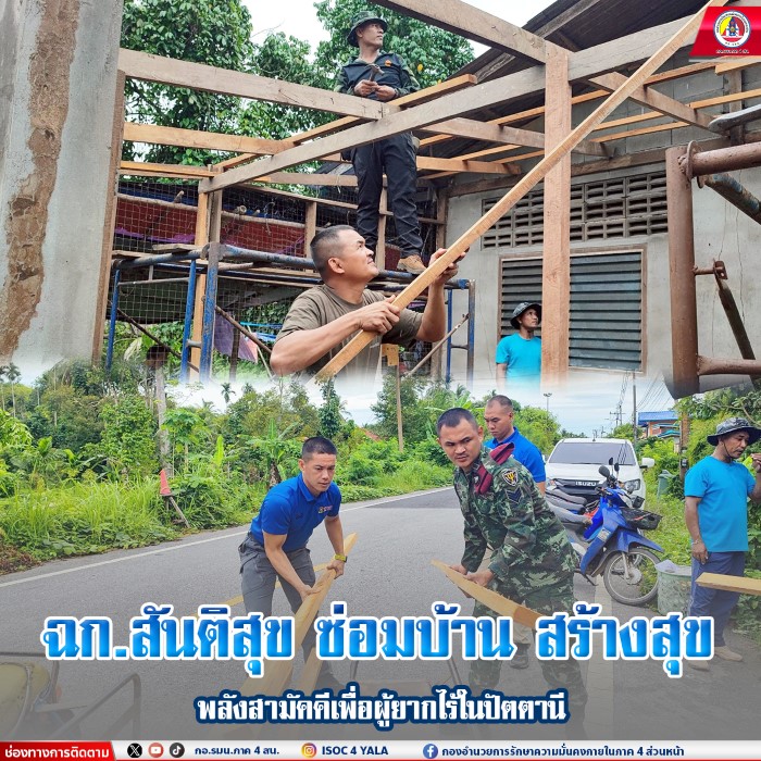 เมื่อบ้านไม่ใช่แค่หลังคา…แต่คือความปลอดภัยและศักดิ์ศรีของการมีชีวิต หน่วยเฉพาะกิจสันติสุข โดยชุดสันติสุขที่ 504 ร่วมกับ ชุดทักษิณสัมพันธ์ที่ 551, สมาชิกกองอาสารักษาดินแดนชุดคุ้มครองตำบลทรายขาว, คณะขับเคลื่อนการพูดคุยสันติสุขระดับพื้นที่ (คพท.), ศูนย์ประสานการแพทย์จังหวัดชายแดนภาคใต้ (ศปกพ.จชต.), กำนัน, ผู้ใหญ่บ้าน, ผู้นำชุมชน, และประชาชนจิตอาสา ร่วมแรงร่วมใจกันซ่อมแซมบ้านที่ทรุดโทรมของ นางรัตนา ทองทราย อายุ 62 ปี ณ บ้านหลวงจันทร์ หมู่ที่ 2 ตำบลทรายขาว อำเภอโคกโพธิ์ จังหวัดปัตตานี