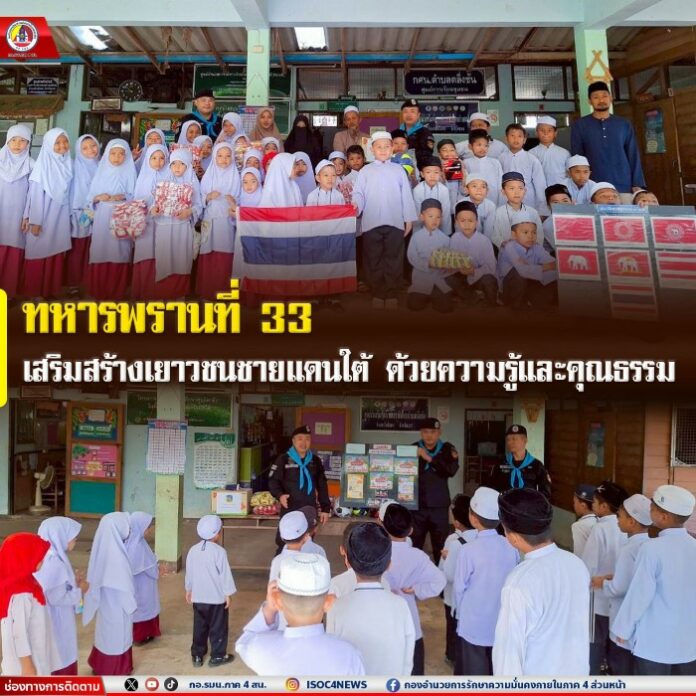 On June 21, 2025, the 33rd Ranger Task Force, through the 3308 Ranger Company, deployed a Civil Affairs Operation Unit to Manasat Wittaya Tadika School in Yilapan Village, Moo 11, Taling Chan Subdistrict, Bannang Sata District, Yala Province. The objective was to engage with and build strong relationships between military personnel, teachers, and students in the area, while fostering knowledge and instilling positive values in local youth — particularly in Thai national history and cultural identity.