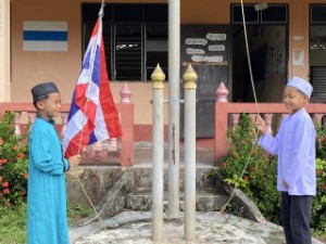อีกหนึ่งไฮไลต์สำคัญของกิจกรรมคือการมอบธงชาติไทยผืนใหม่ให้กับทางโรงเรียน เพื่อใช้ทดแทนธงเดิมที่ชำรุด เสริมสร้างความภาคภูมิใจและตอกย้ำความเป็นหนึ่งเดียวของคนไทยทั้งชาติ ซึ่้งการเข้าไปพบปะของเจ้าหน้าที่ทหารพรานในครั้งนี้สะท้อนให้เห็นถึงบทบาทของทหารในพื้นที่ที่ให้ความสำคัญกับ “หัวใจประชาชน” และยึดมั่นในแนวทาง “เข้าใจ – เข้าถึง – พัฒนา” เพื่อร่วมกันสร้างสันติสุขอย่างยั่งยืนในพื้นที่ชายแดนใต้