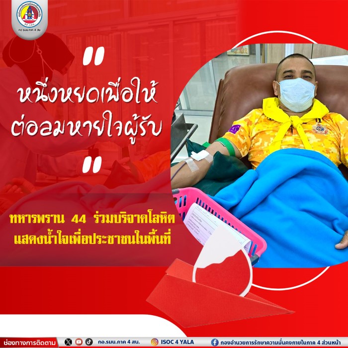หน่วยเฉพาะกิจกรมทหารพรานที่ 44 แสดงพลังจิตอาสาในการช่วยเหลือประชาชนอย่างใกล้ชิด ด้วยการร่วมบริจาคโลหิตเพื่อช่วยชีวิตผู้ป่วยในพื้นที่อำเภอสายบุรี จังหวัดปัตตานี ซึ่งเป็นพื้นที่รับผิดชอบของหน่วย