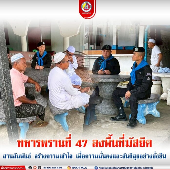 รองผู้บังคับกองร้อยทหารพรานที่ 4714 หน่วยเฉพาะกิจกรมทหารพรานที่ 47 พร้อมกำลังพล ลงพื้นที่พบปะพี่น้องประชาชนที่มาละหมาด ณ มัสยิดยาแมะบาโงยือรา บ้านบาโงยีรา หมู่ที่ 1 ตำบลสะเอะ อำเภอกรงปินัง จังหวัดยะลา เพื่อสร้างความเข้าใจอย่างตรงไปตรงมา และเปิดพื้นที่ให้เกิดการพูดคุยในบรรยากาศแห่งความเคารพซึ่งกันและกัน ทั้งในด้านการพัฒนา ความมั่นคง และการมีส่วนร่วมของประชาชนในแนวทางสันติวิธี
