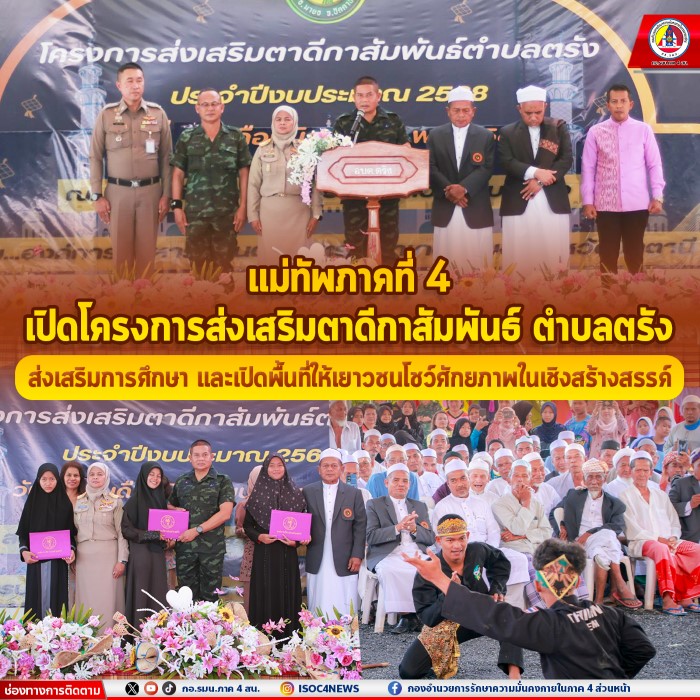 วันที่ 25 มิถุนายน 2568 เวลา 11.05 น. สนามกีฬาองค์การบริหารส่วนตำบลตรังอำเภอมายอ จังหวัดปัตตานี พลโท ไพศาล หนูสังข์ แม่ทัพภาคที่ 4 / ผู้อำนวยการรักษาความมั่นคงภายในภาค 4 เป็นประธานเปิดโครงการส่งเสริมตาดีกาสัมพันธ์ ตำบลตรัง ประจำปี 2568 เพื่อส่งเสริมให้เด็กและเยาวชนในศูนย์การศึกษาอิสลามประจำมัสยิด หรือตาดีกา ได้มีเวทีและโอกาสแสดงความรู้ ทักษะความสามารถ ทั้งทางด้านวิชาการ การอ่านอัลกุรอาน การพูด การแสดงบนเวที และด้านกีฬา ตลอดจนแลกเปลี่ยนเรียนรู้ เสริมสร้างความสัมพันธ์อันดี ที่สำคัญยังเป็นการอนุรักษ์ สืบสาน และฟื้นฟูความเป็นอัตลักษณ์ ภูมิปัญญาท้องถิ่น และวิถีชีวิตมุสลิมตามบริบทของท้องถิ่น