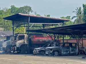 The first incident occurred when arsonists set fire to the registration office and four government vehicles belonging to the Subdistrict Administrative Organization of Paen, Saiburi District. The damaged vehicles included a fire truck, a garbage truck, and two pickup trucks.