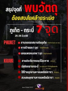 ขณะเดียวกัน เจ้าหน้าที่ได้ค้นหาวัตถุต้องสงสัยในพื้นที่จังหวัดภูเก็ตและกระบี่ พบเพิ่มเติม 7 จุด ประกอบด้วย