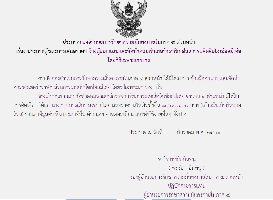 จัดซื้อ จัดจ้างประกาศผู้ชนะการเสนอราคา ประกาศผู้ชนะการเสนอราคา จ้างผู้ออกแบบและจัดทำคอมพิวเตอร์กราฟิก ส่วนการผลิตสื่อโซเชียลมีเดีย โดยวิธีเฉพาะเจาะจง ( ๙๙,๐๐๐.๐๐ บาท ) January 15, 2021 983 Share Facebook Twitter Google+ Telegram LINE กอ.รมน.ภาค ๔ สน.