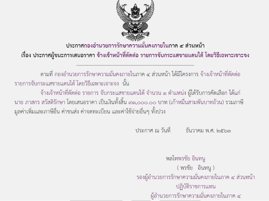 ประกาศผู้ชนะการเสนอราคา จ้างเจ้าหน้าที่ตัดต่อ รายการจับกระแสชายแดนใต้ โดยวิธีเฉพาะเจาะจง ( ๙๓,๐๐๐.๐๐ บาท )