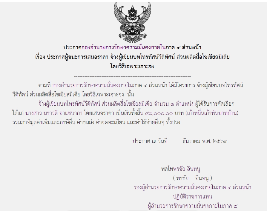 ประกาศผู้ชนะการเสนอราคา จ้างผู้เขียนบทโทรทัศน์วีดิทัศน์ ส่วนผลิตสื่อโซเชียลมีเดีย โดยวิธีเฉพาะเจาะจง ( ๙๙,๐๐๐.๐๐ บาท )