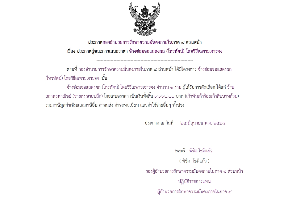 ประกาศผู้ชนะการเสนอราคา จ้างซ่อมจอแสดงผล (โทรทัศน์) โดยวิธีเฉพาะเจาะจง