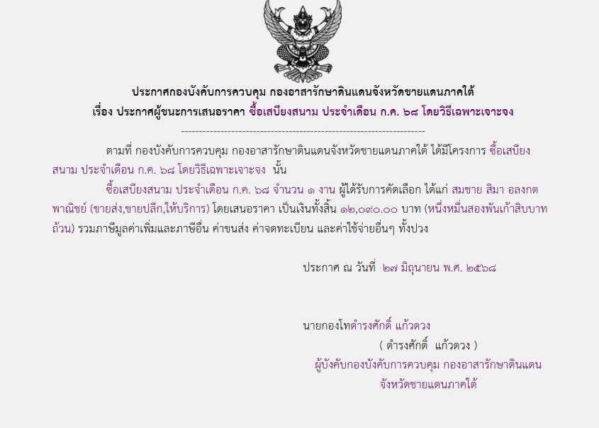 ประกาศผู้ชนะการเสนอราคา ซื้อเสบียงสนาม ประจำเดือน ก.ค. ๖๘ โดยวิธีเฉพาะเจาะจง