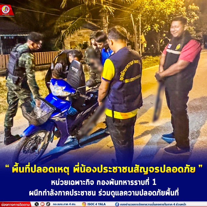 วันที่ 29 มิถุนายน 2568 ณ ตำบลบันนังตา อำเภอบันนังตา จังหวัดยะลา หน่วยเฉพาะกิจ กองพันทหารราบที่ 1 (ฉก.พัน.ร.1) บูรณาการร่วมกับกำลังภาคประชาชนในพื้นที่ จัดตั้งจุดตรวจ/จุดสกัดตามแผน “POP UP” เพื่อดูแลความปลอดภัยของประชาชนผู้ใช้เส้นทางสัญจร และรักษาความปลอดภัยบนถนนสายหลักอย่างเข้มงวด ภายใต้แนวคิด “พื้นที่ปลอดเหตุ พี่น้องประชาชนสัญจรปลอดภัย”