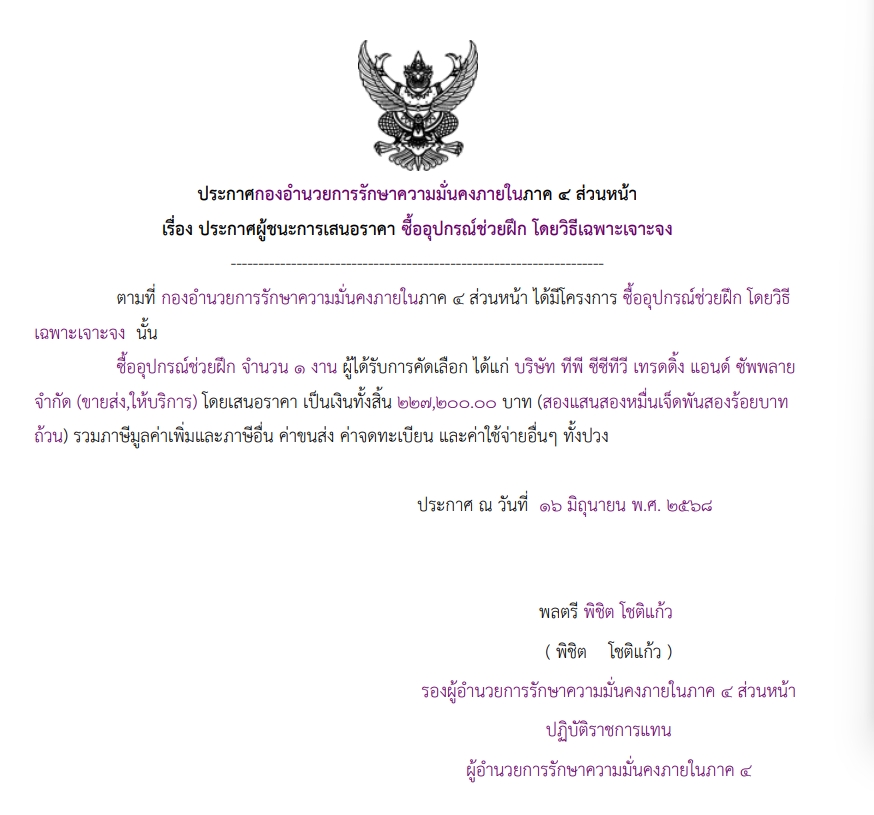 ประกาศผู้ชนะการเสนอราคา ซื้ออุปกรณ์ช่วยฝึก โดยวิธีเฉพาะเราะจง