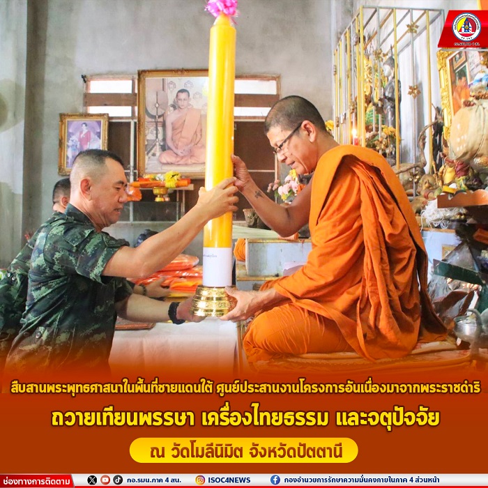 เมื่อวันที่ 1 กรกฎาคม 2568 เวลา 10.30 น. ณ วัดโมลีนิมิต (บ้านหรั่ง) ตำบลมะกรูด อำเภอโคกโพธิ์ จังหวัดปัตตานี พลตรี ณรงค์ ตันติสิทธิพร ผู้บัญชาการกองพลทหารราบที่ 15 / ผู้อำนวยการศูนย์ประสานงานโครงการอันเนื่องมาจากพระราชดำริ พร้อมด้วย พลตรี ฤทธิรณ ศรีภักดี รองผู้อำนวยการฯ และคณะเจ้าหน้าที่ฝ่ายอำนวยการ ร่วมกันประกอบพิธีถวายเทียนพรรษา พร้อมทั้งมอบเครื่องไทยธรรมและจตุปัจจัยแด่ พระครูนิมิตสุตคุณ เจ้าอาวาสวัดโมลีนิมิต