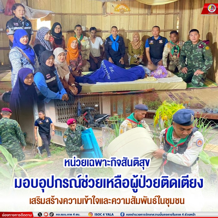 The Santi Suk Task Force, through Santi Suk Unit 302, in collaboration with Southern Relations Unit 331, the Southern Border Provincial Medical Center, Yata Sub-district Health Promoting Hospital, Yata Sub-district Administrative Organization, Ranger Company 4103, Mrs. Sukontip Maneeratsayakon (President of the Community Spokespersons of Raman District), community leaders, and local agencies, jointly provided medical equipment and support tools for bedridden patients in Village No. 3, Yata Sub-district, Raman District, Yala Province.