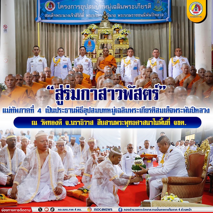 On July 6, 2025, at 9:00 AM, at Wat Thongdee Pracharam, Su-ngai Kolok District, Narathiwat Province, Lieutenant General Paisan Nusang, Commander of the 4th Army Region and Director of the Internal Security Operations Command (Region 4), presided over the mass ordination ceremony held in honor of Her Majesty Queen Sirikit the Queen Mother. The event was organized by the Royal Initiative Coordination Center to pay tribute and offer royal merit on this auspicious occasion, and to demonstrate the loyalty of the Thai people.