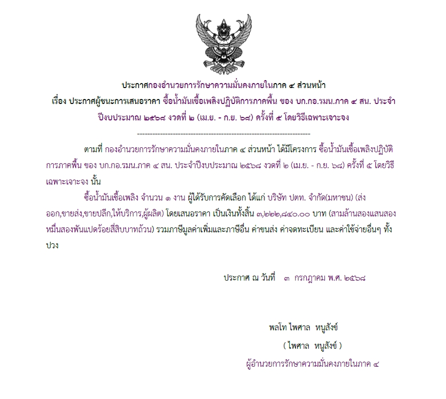 จัดซื้อ จัดจ้างประกาศผู้ชนะการเสนอราคา ประกาศผู้ชนะการเสนอราคา ซื้อน้ำมันเชื้อเพลิงปฏิบัติการภาคพื้น ของ บก.กอ.รมน.ภาค ๔ สน. ประจำปีงบประมาณ ๒๕๖๘ งวดที่ ๒ (เม.ย. – ก.ย. ๖๘) ครั้งที่ ๕ โดยวิธีเฉพาะเจาะจง July 7, 2025 169 Share Facebook Twitter Google+ Telegram LINE
