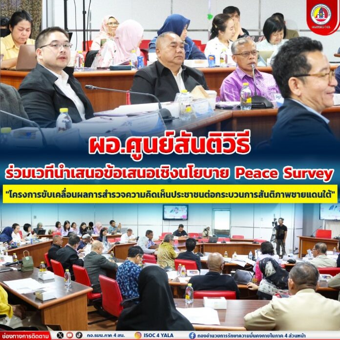 วันนี้ (8 กรกฎาคม 2568) เวลา 10.15 น. ณ ห้องประชุมอัล-อัยยูบีร์ คณะวิทยาการอิสลามนานาชาติ มหาวิทยาลัยสงขลานครินทร์ วิทยาเขตปัตตานี พลตรี เฉลิมชัย สุทธินวล ผู้อำนวยการศูนย์สันติวิธี เป็นวิทยากรร่วมอภิปรายกิจกรรมเครือข่ายวิชาการ Peace Survey ได้จัดงานนำเสนอข้อเสนอเชิงนโยบายการแก้ไขปัญหาจังหวัดชายแดนภาคใต้ ซึ่งเป็นการประมวลผลข้อมูลเชิงปริมาณและเชิงคุณภาพจากการสำรวจความคิดเห็นประชาชนต่อกระบวนการสันติภาพจังหวัดชายแดนภาคใต้ (Peace Survey) ครั้งที่ 1 – 7 โดยดำเนินการระหว่างปี 2559 – 2566 ครอบคลุมประชาชนในพื้นที่จังหวัดปัตตานี ยะลา นราธิวาส และพื้นที่ 4 อำเภอในจังหวัดสงขลา