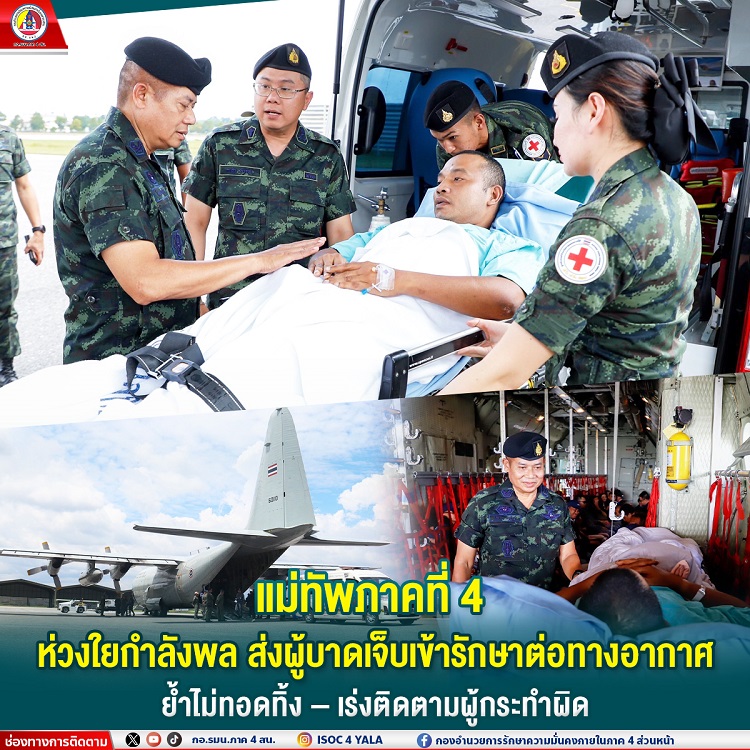 วันนี้ (9 กรกฎาคม 2568) เวลา 13.00 น. ที่ท่าอากาศยานทหาร กองกำลังทางอากาศเฉพาะกิจที่ 9 (กกล.ทอ.ฉก.9) ตำบลบ่อทอง อำเภอหนองจิก จังหวัดปัตตานี พลโท ไพศาล หนูสังข์ แม่ทัพภาคที่ 4 / ผู้อำนวยการรักษาความมั่นคงภายในภาค 4 เดินทางมาให้กำลังใจ จ่าสิบเอก อภิสิทธิ์ ศรีอนุรักษ์ อายุ 43 ปี สังกัดกองพันทหารราบที่ 2 กรมทหารราบที่ 151 ซึ่งได้รับบาดเจ็บจากเหตุคนร้ายขว้างระเบิดและลอบยิงฐานปฏิบัติการชุดคุ้มครองตำบลเกียร์ อำเภอสุคิริน จังหวัดนราธิวาส เมื่อวันที่ 28 มิถุนายนที่ผ่านมา ก่อนส่งตัวไปรักษาต่อยังโรงพยาบาลพระมงกุฎเกล้า กรุงเทพมหานคร ด้วยเครื่องบินลำเลียงแบบ C-130 ของกองทัพอากาศ