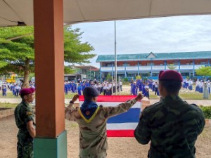 Task Force Santi Suk, led by Santi Suk Unit 505, in collaboration with Southern Relations Unit 551 and members of the Village Protection Volunteer Unit (Or Sor) from Thung Pho Subdistrict, organized a “5-Minute Flag Activity” at Sas Muslim Witthaya School, Ban Khok Ok, Village No. 8, Thung Pho Subdistrict, Saba Yoi District, Songkhla Province.