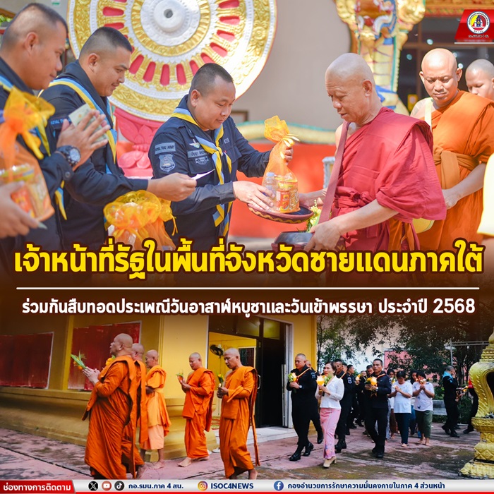 ในช่วงวันที่ 10 – 11 กรกฎาคม 2568 ซึ่งตรงกับวันอาสาฬหบูชา และวันเข้าพรรษา หน่วยงานภาครัฐ โดยเฉพาะในพื้นที่จังหวัดชายแดนภาคใต้ ได้ร่วมกับพุทธศาสนิกชนในพื้นที่จัดกิจกรรมทางศาสนาอย่างพร้อมเพรียง เพื่อทำนุบำรุงพระพุทธศาสนา สืบทอดประเพณีไทยพุทธ และสร้างความสัมพันธ์อันดีระหว่างเจ้าหน้าที่รัฐกับประชาชน