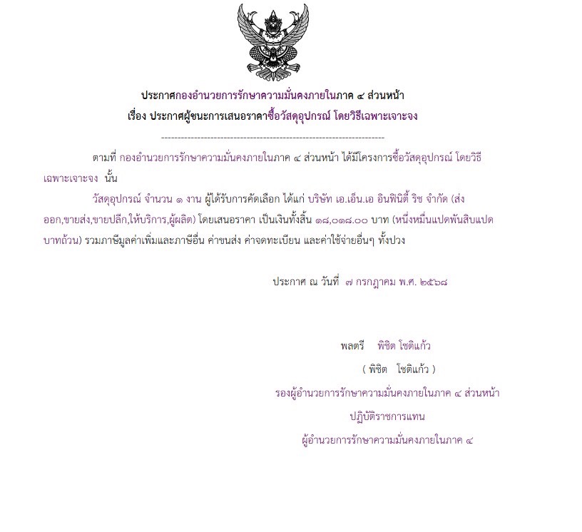ประกาศผู้ชนะการเสนอราคาซื้อวัสอุปกรณ์ โดยวิธีเลพาะเจาะจง