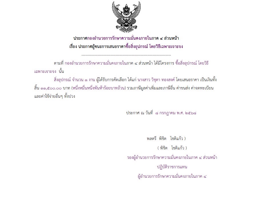 ประกาศผู้ชนะการเสนอราคาซื้อสิ่งอุปกรณ์ โดยวิธีเลพาะเจาะจง