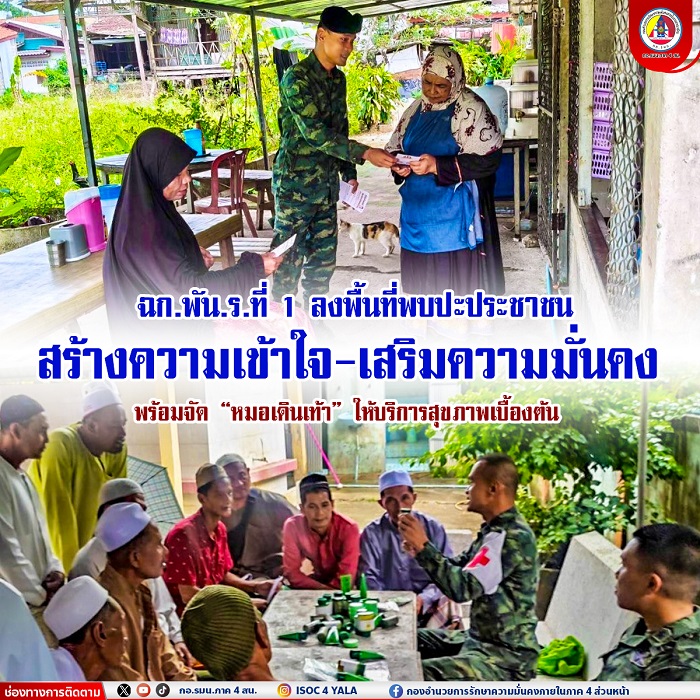 เมื่อวันที่ 13 กรกฎาคม 2568 หน่วยเฉพาะกิจกองพันทหารราบที่ 1 (ฉก.พัน.ร.ที่ 1) จัดกำลังพล ลงพื้นที่ในเขตชุมชนของ อำเภอบันนังสตา จังหวัดยะลา และ อำเภอยะรัง จังหวัดปัตตานี เพื่อพบปะพูดคุยกับพี่น้องประชาชน สร้างความเข้าใจอันดี และเสริมสร้างความมั่นคงในระดับพื้นที่อย่างต่อเนื่อง โดยน้นการพูดคุยสอบถามสภาพความเป็นอยู่ ความต้องการด้านการช่วยเหลือ รวมถึงการประชาสัมพันธ์ข้อมูลข่าวสารที่ถูกต้อง โดยเฉพาะการเฝ้าระวังและป้องกันการบิดเบือนข้อมูลในโลกโซเชียล ที่อาจก่อให้เกิดความเข้าใจผิด และความแตกแยกในสังคม นอกจากนี้ ยังได้ประสานความร่วมมือกับผู้นำชุมชน และผู้นำศาสนา เพื่อเป็นสะพานเชื่อมโยงความเข้าใจระหว่างรัฐและประชาชน พร้อมทั้งจัดกิจกรรมสร้างสัมพันธ์อันดีในพื้นที่รับผิดชอบ