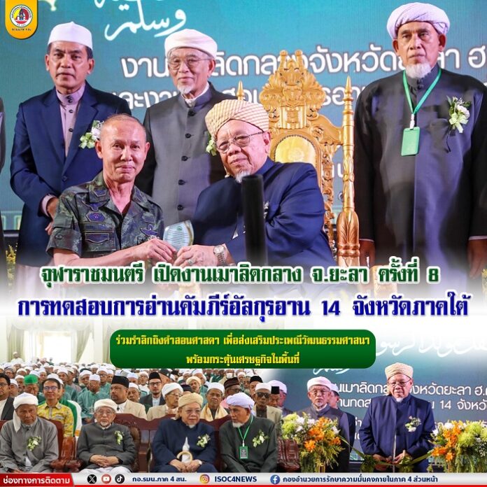 วันนี้ (14 กรกฎาคม 2568) นายอรุณ บุญชม จุฬาราชมนตรี ลงพื้นที่จังหวัดยะลา เป็นประธานเปิดงานเมาลิดกลาง จ.ยะลา ครั้งที่ 8 ประจำปีฮิจเราะห์ศักราช 1447 และการทดสอบการอ่านคัมภีร์อัลกุรอ่าน 14 จังหวัดภาคใต้ โดยมี พลตรี กรกฎ ภู่โชติ รองผู้อำนวยการรักษาความมั่นคงภายในภาค 4 ส่วนหน้า เป็นผู้แทนแม่ทัพภาคที่ 4 /ผู้อำนวยการรักษาความมั่นคงภายในภาค 4 พร้อมด้วย ผู้แทนจากศูนย์อำนวยการบริหารจังหวัดชายแดนภาคใต้ ปลัดจังหวัดยะลา ประธานกรรมการอิสลามประจำจังหวัดยะลา นายกสมาคมกอรีแห่งประเทศไทย นายกองค์การบริหารส่วนจังหวัดยะลา คณะกรรมการจัดงาน ผู้นำศาสนาและส่วนที่เกี่ยวข้องเข้าร่วมกิจกรรม
