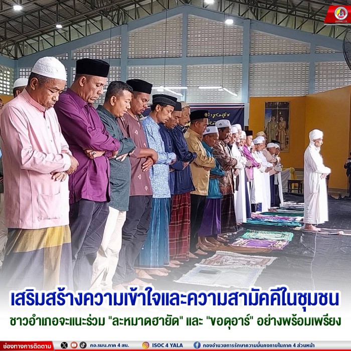 On July 16, 2025, at 9:00 a.m., at the Cho-airong District Hall in Ban Manang Kayang, Village No. 3, Cho-airong Subdistrict, Cho-airong District, Narathiwat Province, a communal religious activity was held involving the performance of Solat Hajat and Dua (supplication to Allah) to promote unity and solidarity within the community. This event also served as a collective declaration of intent to safeguard peace in the area and to stand firmly against all forms of violence.