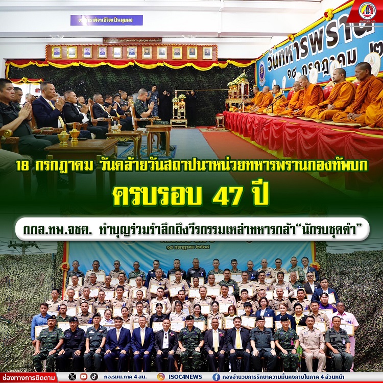 วันที่ 18 กรกฎาคม 2568 เวลา 10.00 ณ กองบังคับการกองกำลังทหารพรานจังหวัดชายแดนภาคใต้ ค่ายอิงคยุทธบริหาร ตำบลบ่อทอง อำเภอหนองจิก จังหวัดปัตตานี พลตรี วรเดช เดชรักษา รองแม่ทัพภาคที่ 4 / รองผู้อำนวยการรักษาความมั่นคงภายในภาค 4 ส่วนหน้า เป็นประธานในพิธีทางศาสนาพุทธ เนื่องในวันคล้ายวันสถาปนาหน่วยทหารพรานกองทัพบก ครบรอบ 47 ปี โดยกองกำลังทหารพรานจังหวัดชายแดนภาคใต้ จัดขึ้นเพื่อ รำลึกถึงวีรกรรมของเหล่าผู้เสียสละ และทหารกล้า ที่ยอมเสียสละชีวิตเลือดเนื้อ เพื่อปกป้องอธิปไตยของประเทศชาติ รวมทั้งเพื่อความเป็นสิริมงคลแก่หน่วยทหารพราน และกำลังพลในสังกัดอีกด้วย โดยมี พันเอก หาญพล เพชรม่วง ผู้บังคับกองกำลังทหารพรานจังหวัดชายแดนภาคใต้ พร้อมด้วย อดีตผู้บังคับบัญชา คณะผู้บังคับบัญชา รวมทั้งผู้บังคับหน่วยเฉพาะกิจกรมทหารพรานในพื้นที่ ร่วมพิธี นอกจากนี้ภายในงานยังมีพิธีมอบประกาศนียบัตร , เครื่องหมายเชิดชูเกียรติหน่วยทหารพรานกิตติมศักดิ์ และมอบโล่ให้กับกำลังพลดีเด่น รวมถึงการจัดแสดงนิทรรศการยุทโธปกรณ์พิเศษ นิทรรศการการปฏิบัติในภารกิจต่างๆของหน่วยปฏิบัติการพิเศษร่วม มาจัดเเสดงให้คณะผู้บังคบบัญชา และผู้ร่วมงานได้รับชมอีกด้วย