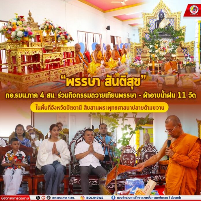 วันนี้ (19 กรกฎาคม 2568) เวลา 09.00 น. ที่ วัดมุจลินทวาปีวิหาร พระอารามหลวง (วัดตุยง) ตำบลตุยง อำเภอหนองจิก จังหวัดปัตตานี พลตรี ฤทธิรณ ศรีภักดี รองผู้อำนวยการศูนย์ประสานงานโครงการอันเนื่องมาจากพระราชดำริ เป็นประธานฝ่ายฆราวาส ในพิธีถวายเทียนพรรษา – ผ้าอาบน้ำฝน พร้อมจตุปัจจัย เพื่อเป็นพุทธบูชาแด่วัดในพื้นที่จังหวัดปัตตานี จำนวน 11 วัด พร้อมด้วย พันเอก อนุชา โนนคู่เขตโขง รองเลขาธิการ กองอำนวยการรักษาความมั่นคงภายในภาค 4 ส่วนหน้า ร่วมในพิธีครั้งนี้ เพื่อเป็นส่วนหนึ่งในการทำนุบำรุงพระพุทธศาสนา, สืบสานประเพณีอันดีงามของพี่น้องชาวพุทธ และเสริมความเป็นสิริมงคลในห้วงเทศกาลเข้าพรรษาประจำปี 2568 ของพี่น้องพุทธศาสนิกชน โดยมี พระสุทธิสมณวัตร เจ้าอาวาสวัดมุจลินทวาปีวิหาร พระอารามหลวง เป็นประธานฝ่ายสงฆ์ ตลอดจนพี่น้องพุทธศาสนิกชนทั้งในและนอกพื้นที่จังหวัดชายแดนภาคใต้ เข้าร่วมในพิธีด้วยความอบอุ่น