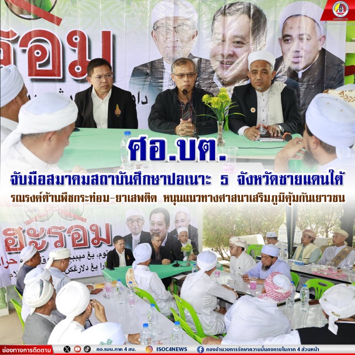 วันที่ 20 กรกฎาคม 2568 เวลา 11.45 น. นายนันทพงศ์ สุวรรณรัตน์ รองเลขาธิการศูนย์อำนวยการบริหารจังหวัดชายแดนภาคใต้ พร้อมด้วย นายธีรวิทย์ เฑียรฆโรจน์ ผู้อำนวยการกองส่งเสริมและสนับสนุนงานพัฒนาเพื่อความมั่นคง ลงพื้นที่ สถาบันศึกษาปอเนาะอัลฮาซานีวิทยา หมู่ที่ 6 ตำบลเตราะบอน อำเภอสายบุรี จังหวัดปัตตานี พบปะ นายมูฮำมัดซูวรี สาแล นายกสมาคมสถาบันศึกษาปอเนาะ 5 จังหวัดชายแดนภาคใต้ และคณะกรรมการสมาคมฯ ซึ่งเป็นตัวแทนสถาบันปอเนาะในพื้นที่ กว่า 30 คน เพื่อสื่อสารสร้างความเข้าใจเดินหน้าขับเคลื่อน “แผนปฏิบัติการ 120 วัน ป้องกันและแก้ไขปัญหายาเสพติดใน จชต. แบบบูรณาการในทุกมิติ” ตั้งแต่วันที่ 1 มิถุนายน ถึงวันที่ 30 กันยายน 2568 เพื่อลดปัญหาการค้า การใช้พืชกระท่อมในทางที่ผิด รวมถึงยาเสพติด และรวมพลังผู้นำศาสนาประชาชนให้มีส่วนร่วมในการแก้ไขปัญหาเพิ่มมากขึ้น