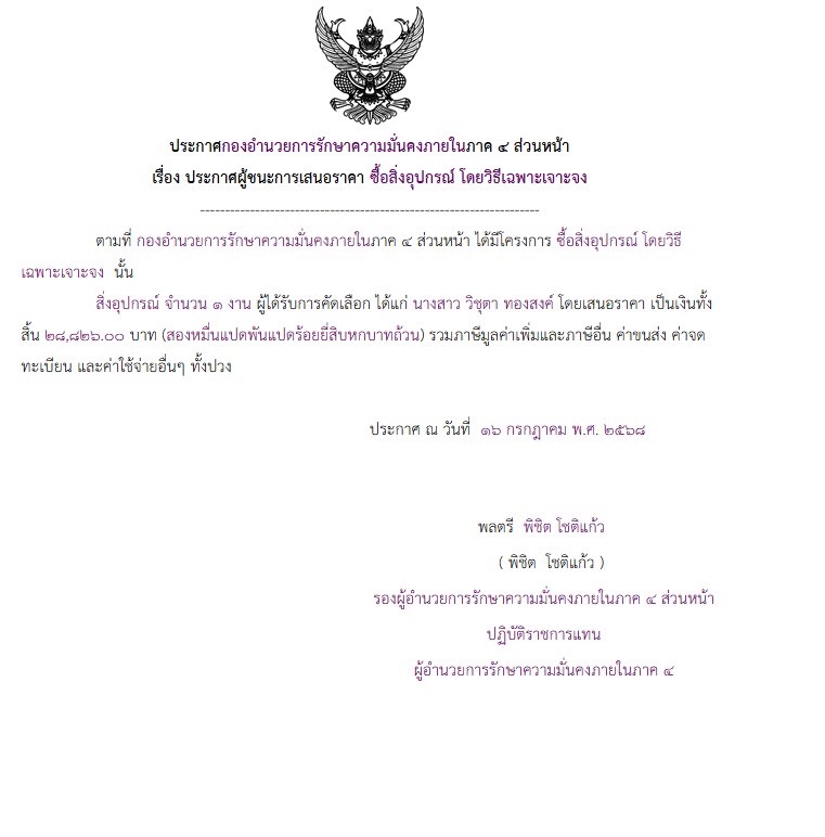 ประกาศผู้ชนะการเสนอราคา ซื้อสิ่งอุปกรณ์ โดยวิธีเฉพาะเจาะจง
