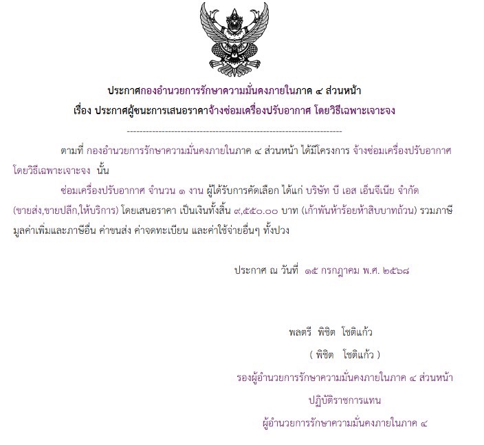 ประกาศผู้ชนะการเสนอราคาจ้างซ่อมเครื่องปรับอากาศ โดยวิธีเฉพาะเจาะจง